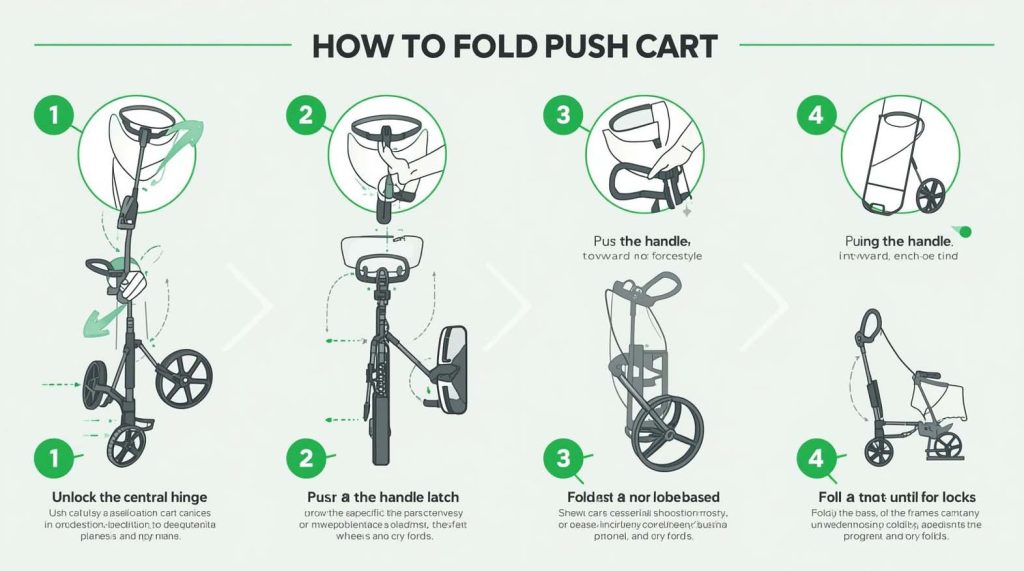 To fold a golf push cart, unlock the central hinge on the frame, push the handle forward and down toward the front wheel, release the handle latch as it passes the folding point, fold the front wheel inward or flat, then collapse the frame until it locks into its compact folded position.